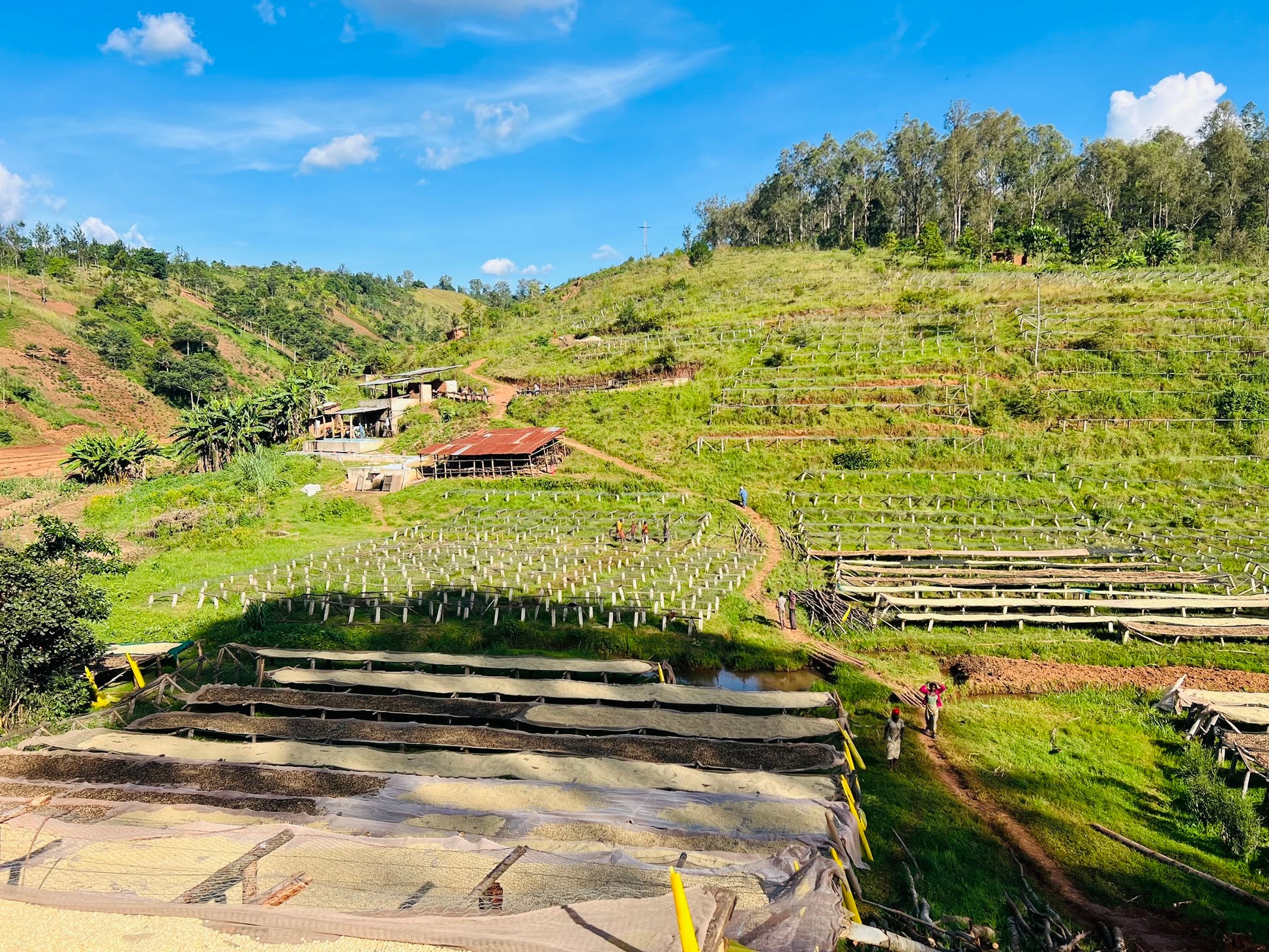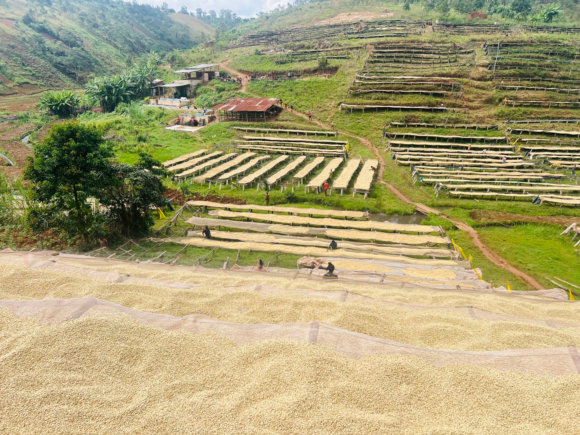 Busasa Coffee Washing Station, established in 2014 in the Gashoho area of northern Burundi, sources coffee from approximately 1,600 smallholder farmers in the surrounding hills. The station operates with a core team of six full-time staff and up to 150 seasonal workers, and is equipped with 151 African drying beds. Farmers delivering to Busasa receive a 20% premium above local market prices, while station staff earn wages nearly 60% higher than the national average. Busasa is part of Matraco, a Burundian-owned company that also operates two additional washing stations in the region. Matraco supports producers through compost distribution and seedling donations, and maintains close quality oversight by transporting coffee using its own fleet of trucks. As Burundi’s coffee sector has liberalized, increased access to washing stations and quality incentives has helped farmers improve both cup quality and livelihoods.